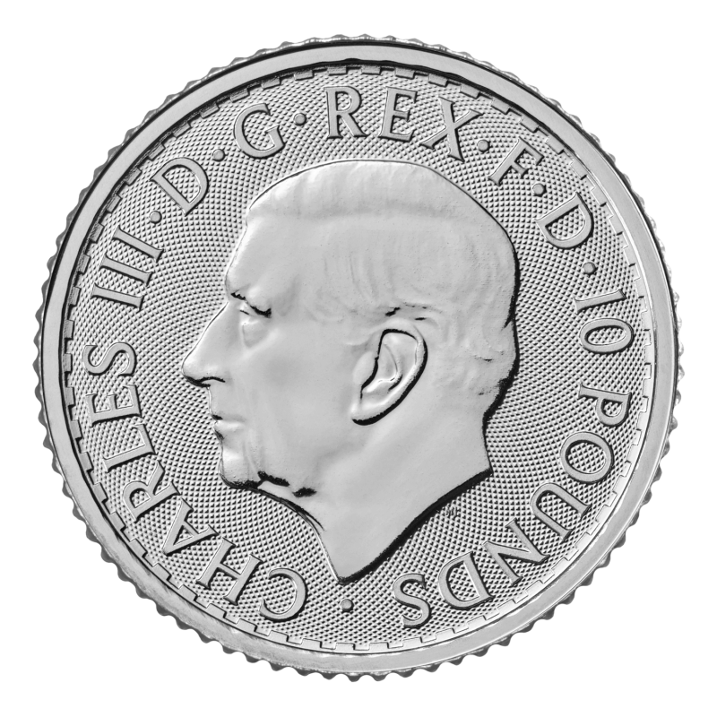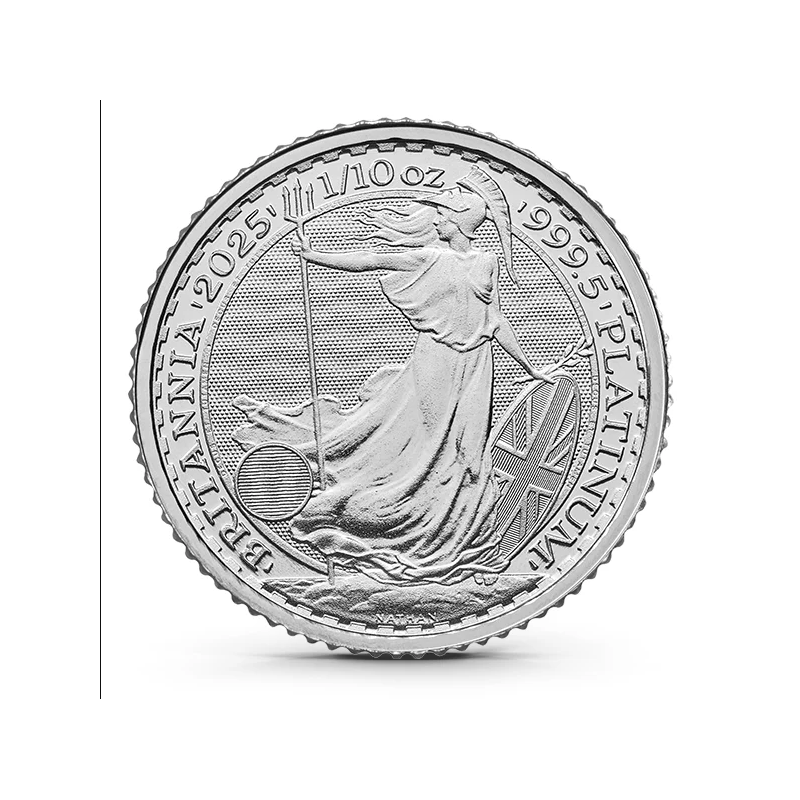 The 2025 Britannia 1/10 oz Pt 999.5 is an elegant platinum bullion coin issued by The Royal Mint. The obverse features a portrait of King Charles III, while the reverse depicts the classic Britannia figure with shield and trident. It is made of 99.95% pure platinum, weighing 0.10 troy ounces. The coin serves both as an attractive collectible and a form of platinum investment.