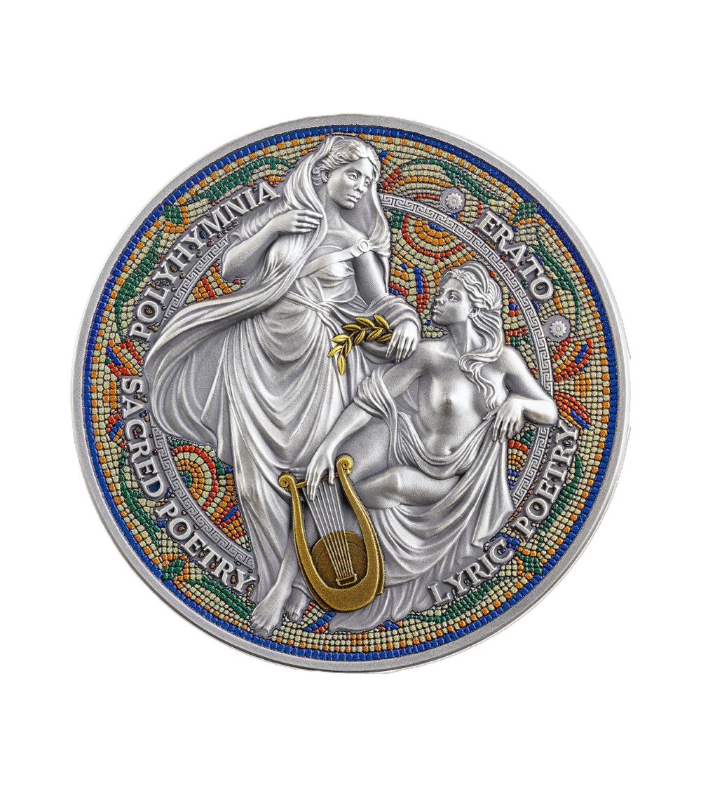 We proudly present the coin, struck from 2 ounces of pure Ag999 silver in proof quality. Its flawless finish highlights the extraordinary precision and depth of the intricate design. The artwork depicts Erato and Polyhymnia, two of the Nine Muses, symbolizing love poetry, sacred music, and divine inspiration. Elegant detailing and refined composition create a timeless, almost ethereal visual effect. This limited mintage issue is a tribute to classical mythology and the enduring power of artistic expression.