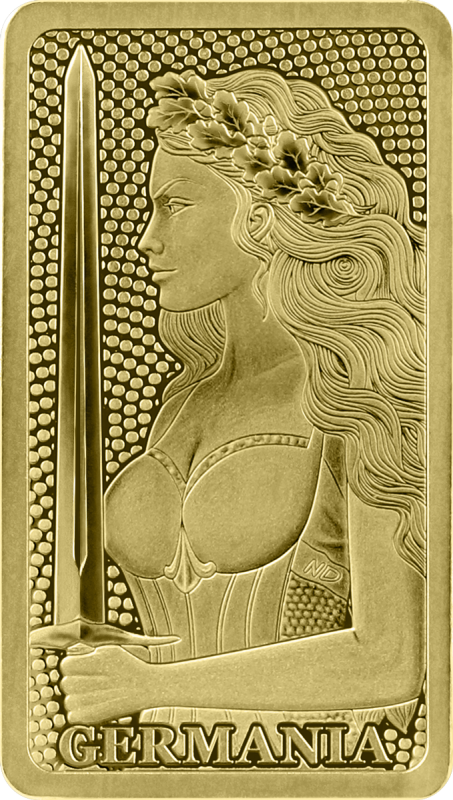 Minimalistyczne sztabki Germania Mint 1/100 oz Au Proof 999.9 Minted Bar z wizerunkiem Germanii, zamknięte w eleganckim, czarnym Safepacku, łączą luksus złota z subtelną finezją.