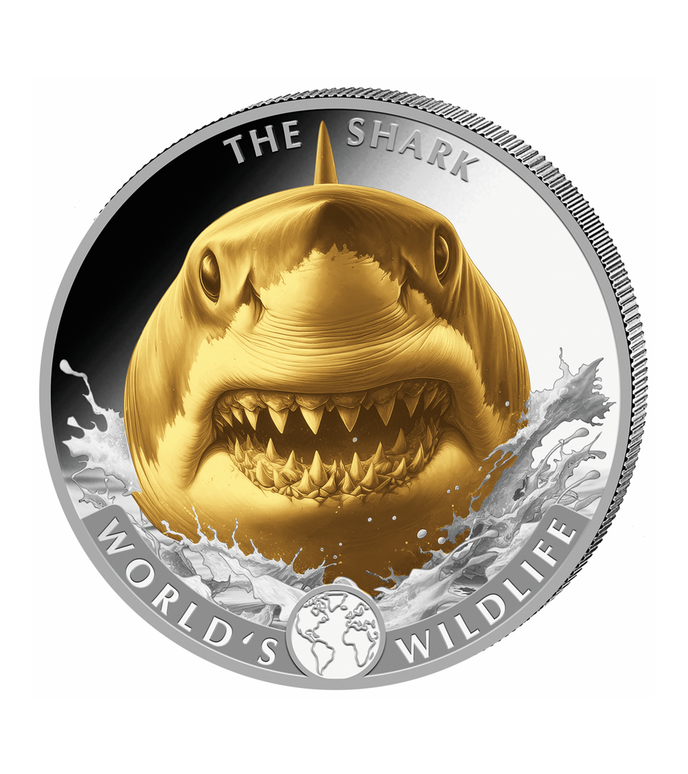 Wyjątkowa wersja 50monety Shark 2026 Congo z selektywnie złoconymi elementami. Wybita w 1 uncji srebra .9999, łączy wartość kolekcjonerską z efektownym wykończeniem i limitowanym nakładem.